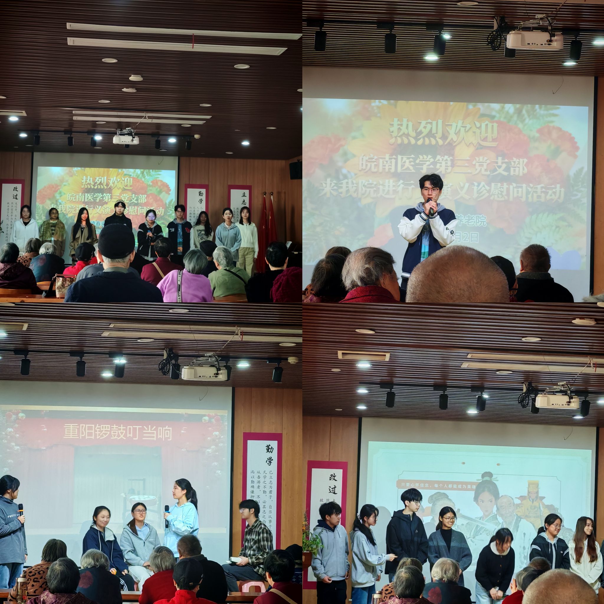 文艺表演环节将气氛推向高潮。话剧社团学生表演的情景剧《不上你的当》寓教于乐、独唱《少年中国说》激荡人心、话剧《木兰辞》传承经典、情景剧《重阳锣鼓响叮当》温情热烈,营造出浓厚的节日氛围,精彩演绎博得老人们阵阵掌声,现场洋溢着欢声笑语。