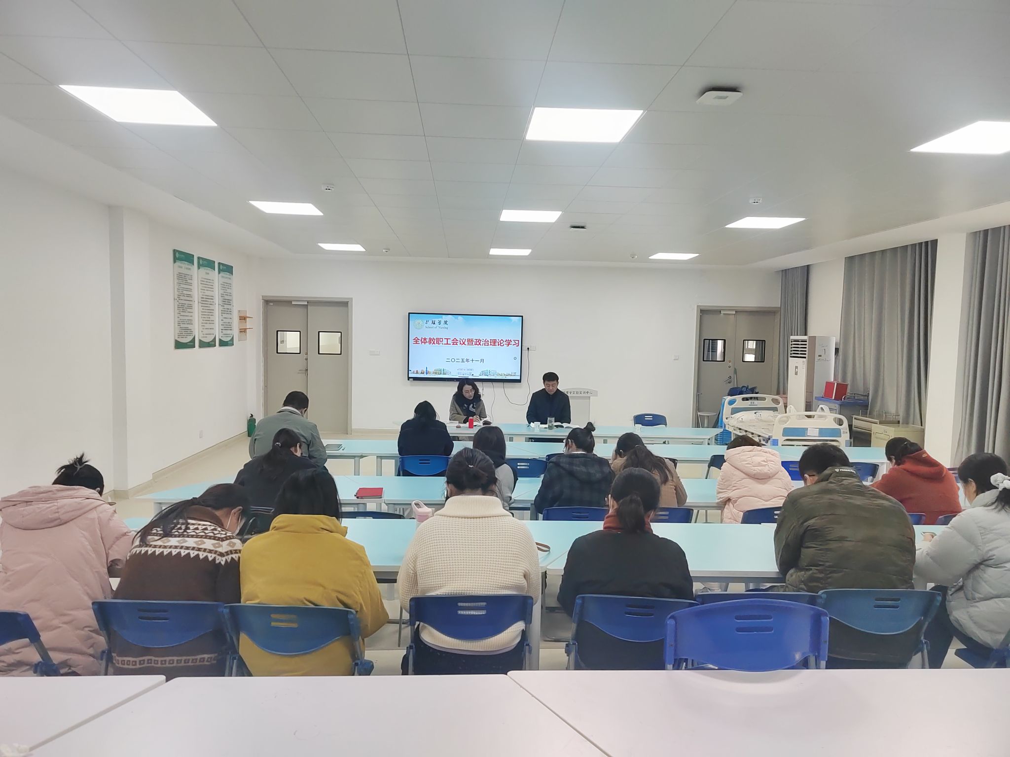 11月27日上午,护理学院在智慧教室召开教职工理论学习会。会议由护理学院党委副书记王亚娟主持。
