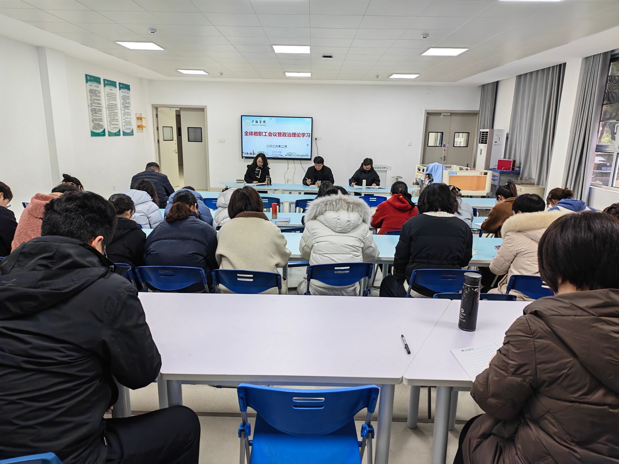 2月27日下午,护理学院在智慧教室召开教职工理论学习会。学院负责人和全体教职工参加会议。会议由学院党委副书记王亚娟主持。