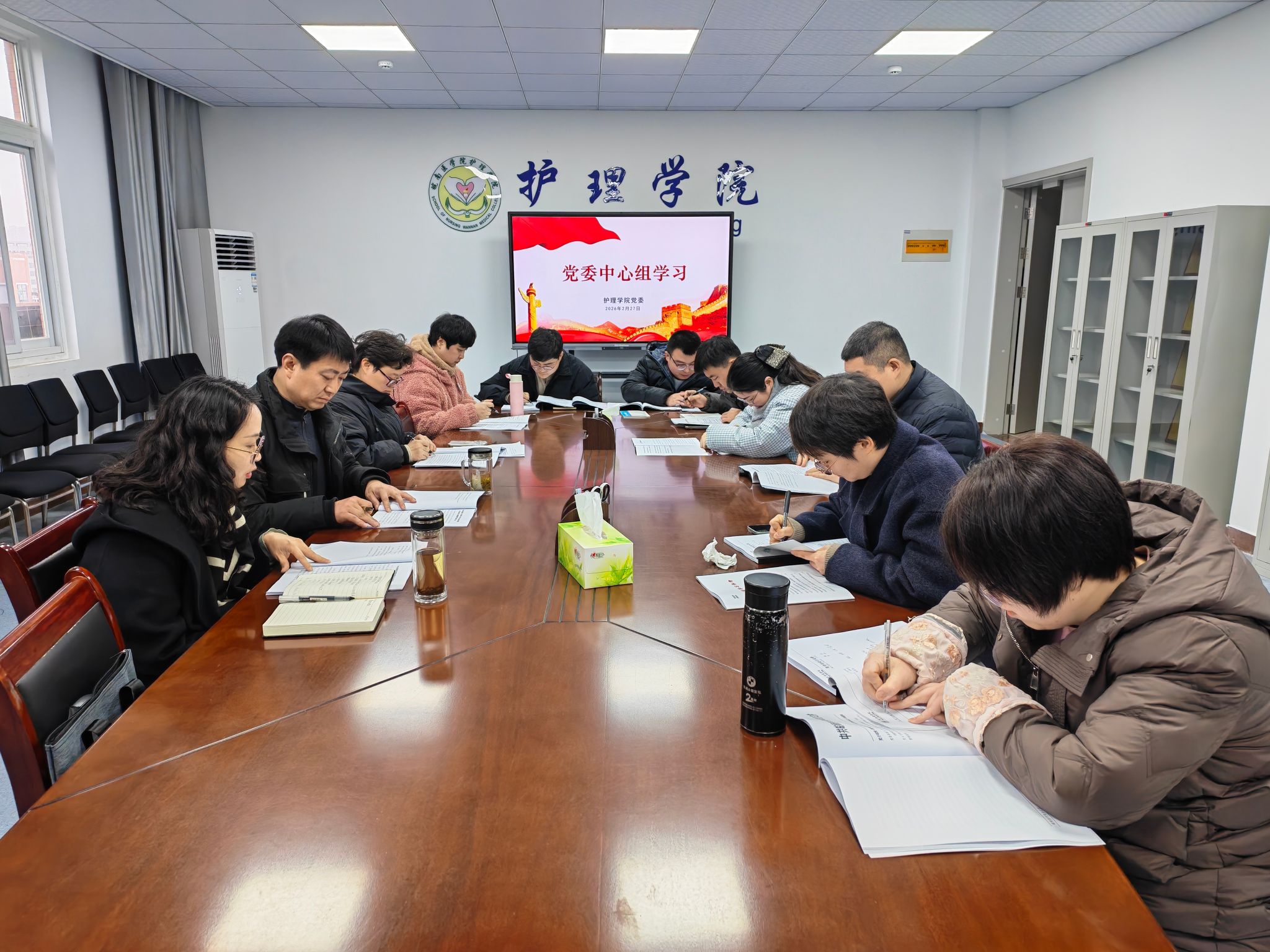 2月27日下午,护理学院召开党委中心组学习扩大会,学院班子成员、党委委员和党支部书记参加会议。会议由学院党委书记陈抗震主持。