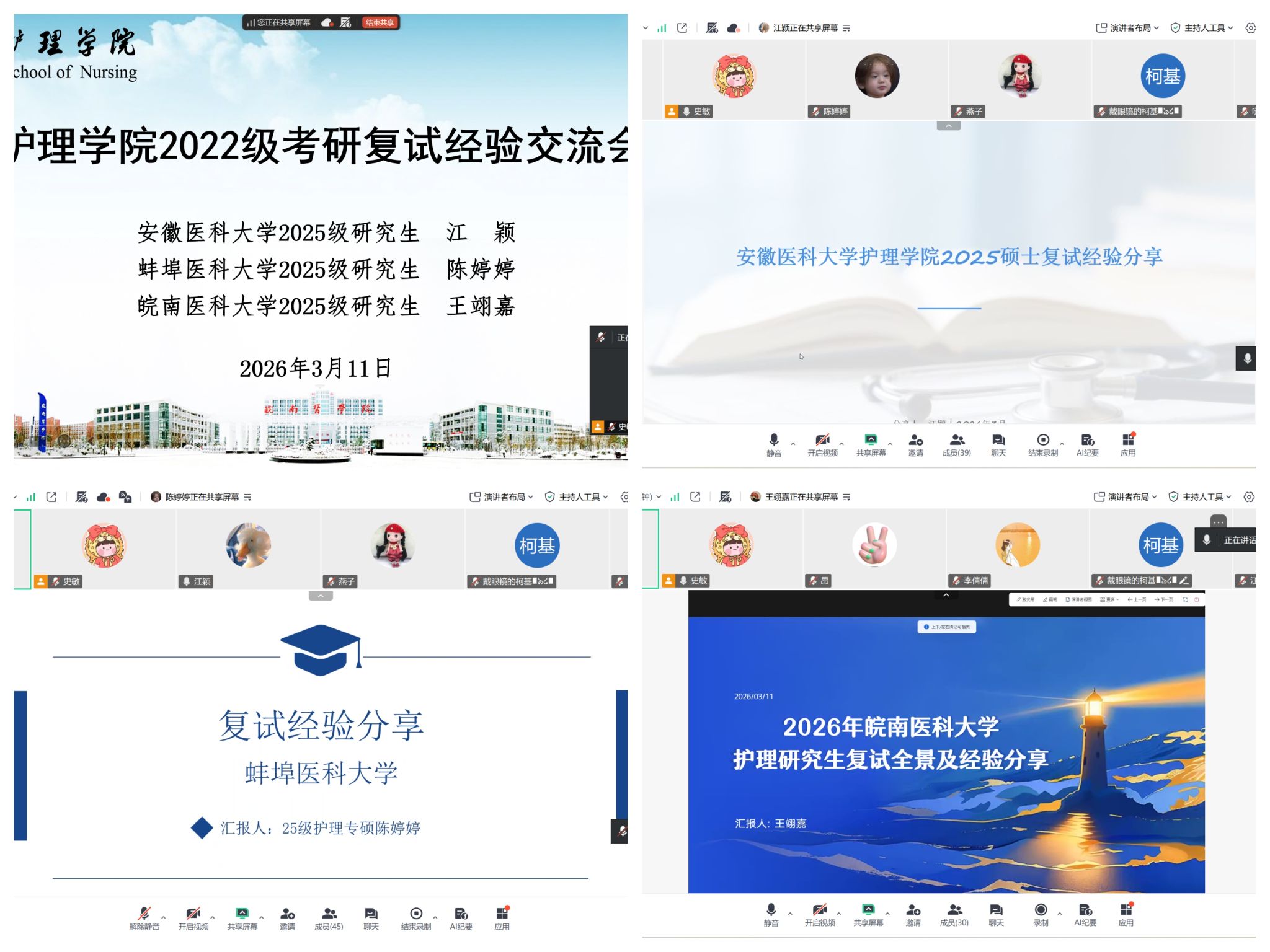 为帮助2026届考研学子更好地了解复试流程、掌握备战技巧,增强应试信心,3月11日,护理学院通过腾讯会议举办考研复试经验交流会。辅导员及2026届考研学生参会,会议由辅导员史敏主持。