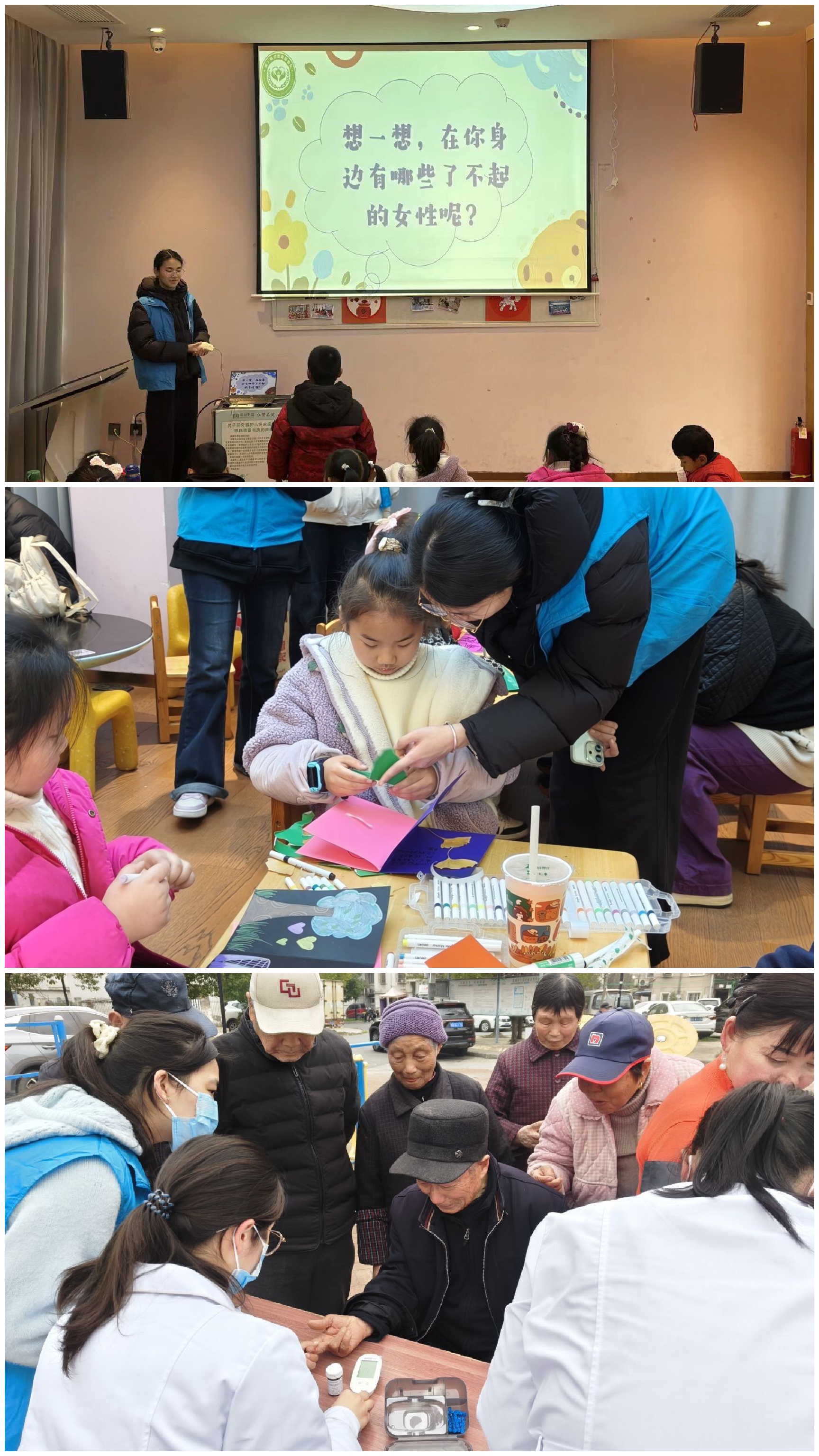 作为学院志愿服务品牌,南丁格尔志愿服务队在“雷锋月”期间多点发力,将专业优势转化为服务群众的生动实践。3月7日,服务队走进江湾书院,开展“春风暖巾帼、童心绘芳华”妇女节主题活动。志愿者们为孩子们讲述妇女节的起源与意义,引导他们用画笔描绘心中“最美的她”,在童心播撒感恩与敬意的种子。活动中还穿插了女性健康与儿童营养知识科普,受到家长一致好评。
